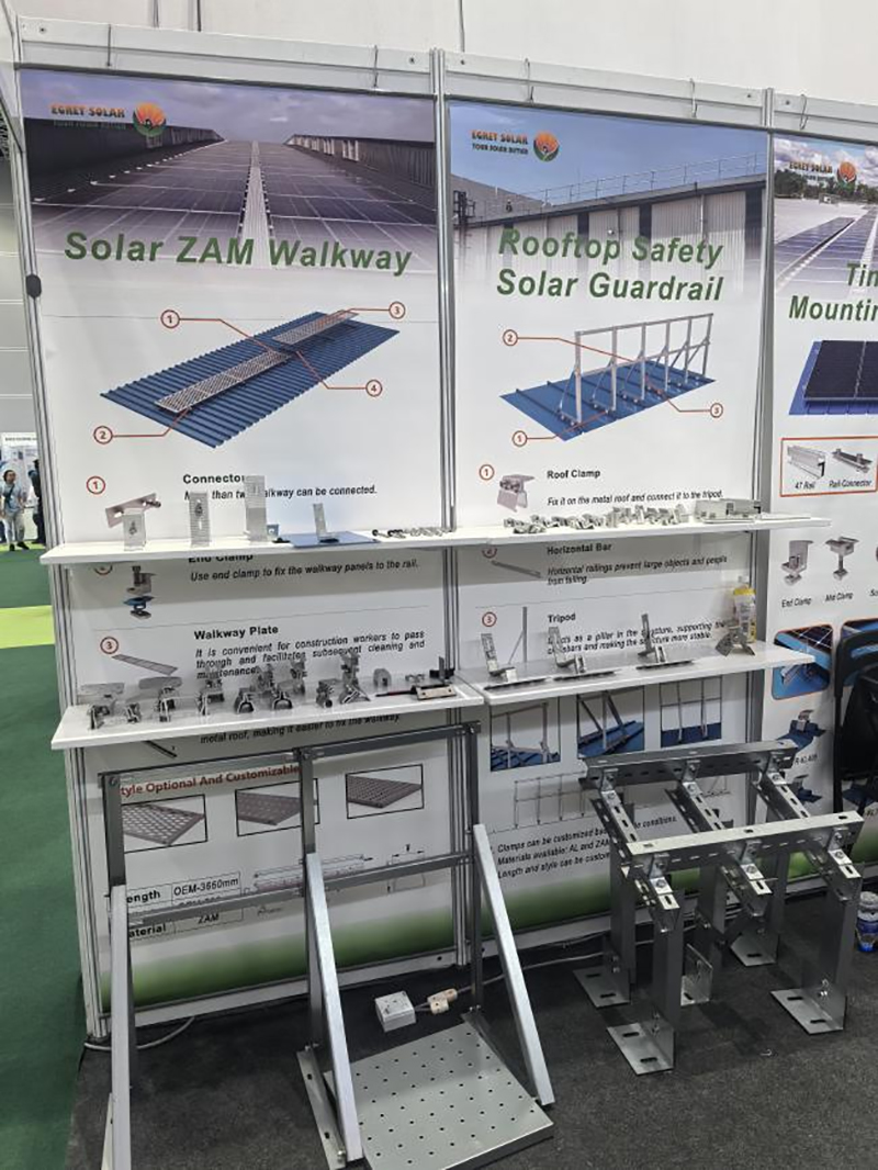 Näitusel tutvustasime mitmeid katusetarvikuid, sealhulgas klambrid, konksud ja L-jalad. Kliendid saavad vastavalt paigalduskeskkonnale valida erinevaid kombinatsioone. Värviga kaetud terasplaatide puhul kasutatakse klambreid või L-jalgu, keraamiliste plaatide puhul aga katusekivikonksu päikeseenergiat. Samuti saame kohandada klambreid vastavalt kliendi värviga kaetud terasplaadi mudelile või pikendada konksu vart, et need sobiksid kohapealse kasutusega.